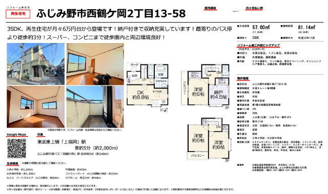 | 特色 | 角地、公営水道、公共本下水、都市ガス、システムキッチン、浴室1坪以上、トイレ2ヵ所、保育園(1キロ圏内)、コンビニ(徒歩10分以内)、スーパー(徒歩5分以内) |